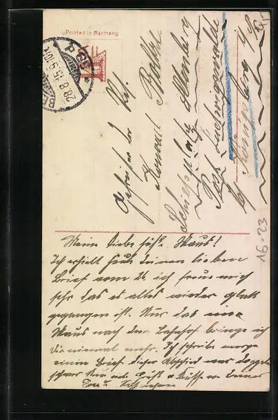 Personenbezogene Daten auf der Rückseite der Karte wurden durch blauen Textmarker unkenntlich gemacht. Die blauen Stellen sind auf die Vorderseite durchgeweicht und wirken sich negativ auf das Postkartenfoto aus