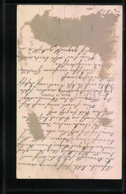 Personenbezogene Daten auf der Rückseite der Karte wurden durch blauen Textmarker unkenntlich gemacht. Die blauen Stellen sind auf die Vorderseite durchgeweicht und wirken sich negativ auf das Postkartenfoto aus