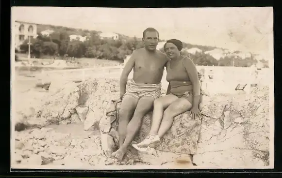 Foto-AK Paar in Badehose und Badeanzug am Ufer
