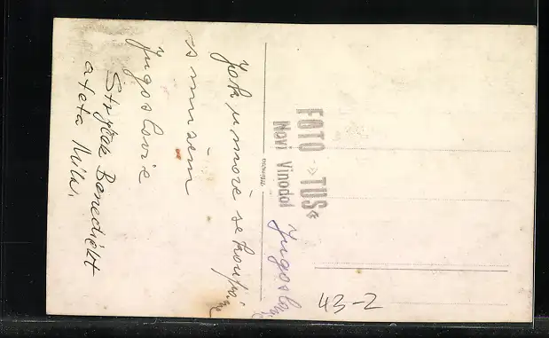 Personenbezogene Daten auf der Rückseite der Karte wurden durch blauen Textmarker unkenntlich gemacht. Die blauen Stellen sind auf die Vorderseite durchgeweicht und wirken sich negativ auf das Postkartenfoto aus
