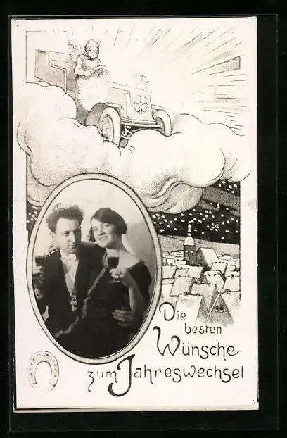 Foto-AK Pärchen mit Weingläsern, Engel im Auto auf Wolke, Neujahrsgruss, Passepartout