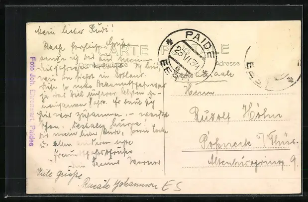 Personenbezogene Daten auf der Rückseite der Karte wurden durch blauen Textmarker unkenntlich gemacht. Die blauen Stellen sind auf die Vorderseite durchgeweicht und wirken sich negativ auf das Postkartenfoto aus