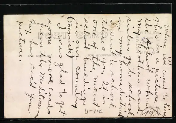 Personenbezogene Daten auf der Rückseite der Karte wurden durch blauen Textmarker unkenntlich gemacht. Die blauen Stellen sind auf die Vorderseite durchgeweicht und wirken sich negativ auf das Postkartenfoto aus