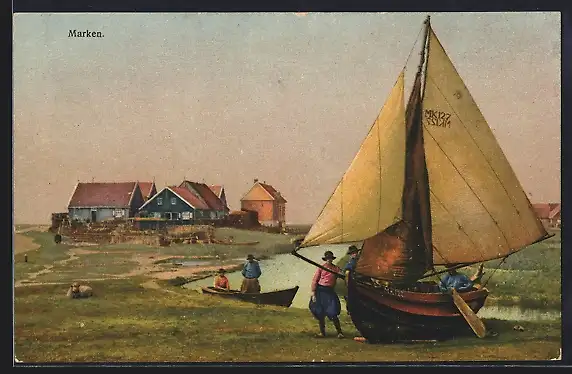 Foto-AK Photochemie Berlin Serie 164, Nr. 2946: Marken, Holländer mit einem Segelboot