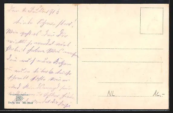 Personenbezogene Daten auf der Rückseite der Karte wurden durch blauen Textmarker unkenntlich gemacht. Die blauen Stellen sind auf die Vorderseite durchgeweicht und wirken sich negativ auf das Postkartenfoto aus
