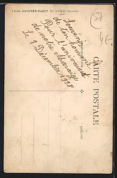 Personenbezogene Daten auf der Rückseite der Karte wurden durch blauen Textmarker unkenntlich gemacht. Die blauen Stellen sind auf die Vorderseite durchgeweicht und wirken sich negativ auf das Postkartenfoto aus