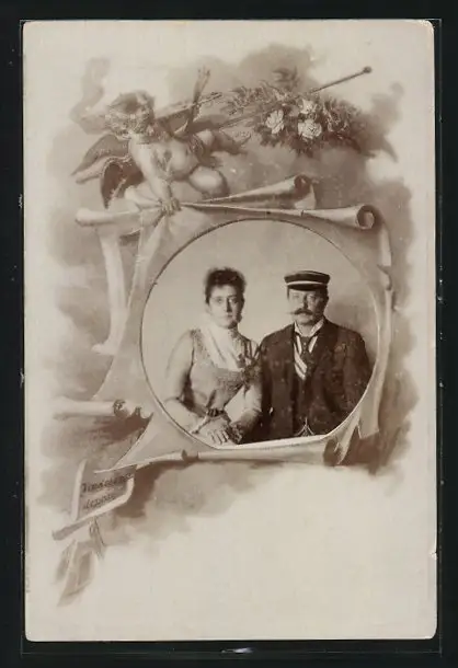 Foto-AK Portrait eines Paares, Passepartout mit Amor