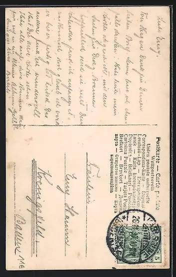 Personenbezogene Daten auf der Rückseite der Karte wurden durch blauen Textmarker unkenntlich gemacht. Die blauen Stellen sind auf die Vorderseite durchgeweicht und wirken sich negativ auf das Postkartenfoto aus