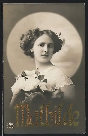 Foto-AK R & K / L Nr. 4799/6: Junge Frau mit Blumen im Arm, Mathilde