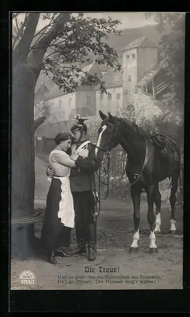 Foto-AK R & K / L Nr. 5711/3: Soldat umarmt Frau, Pferd
