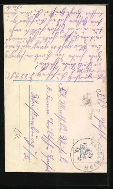 Personenbezogene Daten auf der Rückseite der Karte wurden durch blauen Textmarker unkenntlich gemacht. Die blauen Stellen sind auf die Vorderseite durchgeweicht und wirken sich negativ auf das Postkartenfoto aus