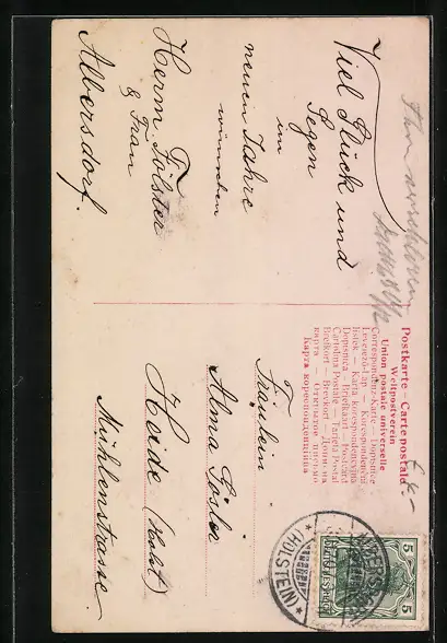 Personenbezogene Daten auf der Rückseite der Karte wurden durch blauen Textmarker unkenntlich gemacht. Die blauen Stellen sind auf die Vorderseite durchgeweicht und wirken sich negativ auf das Postkartenfoto aus