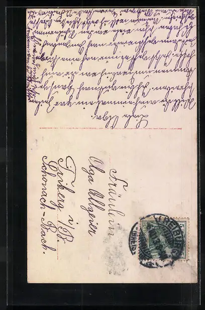 Personenbezogene Daten auf der Rückseite der Karte wurden durch blauen Textmarker unkenntlich gemacht. Die blauen Stellen sind auf die Vorderseite durchgeweicht und wirken sich negativ auf das Postkartenfoto aus