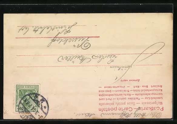 Personenbezogene Daten auf der Rückseite der Karte wurden durch blauen Textmarker unkenntlich gemacht. Die blauen Stellen sind auf die Vorderseite durchgeweicht und wirken sich negativ auf das Postkartenfoto aus