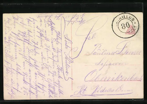 Personenbezogene Daten auf der Rückseite der Karte wurden durch blauen Textmarker unkenntlich gemacht. Die blauen Stellen sind auf die Vorderseite durchgeweicht und wirken sich negativ auf das Postkartenfoto aus
