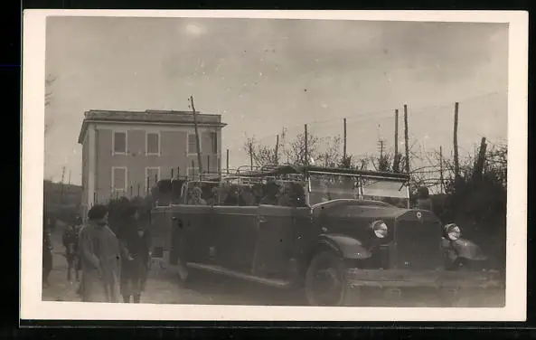 Foto-AK Reisebus fährt durch eine Ortschaft
