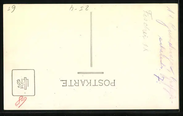 Personenbezogene Daten auf der Rückseite der Karte wurden durch blauen Textmarker unkenntlich gemacht. Die blauen Stellen sind auf die Vorderseite durchgeweicht und wirken sich negativ auf das Postkartenfoto aus