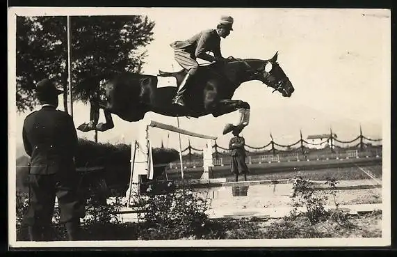 Foto-AK Reiter beim Sprung über die Hürde auf einem Sportplatz