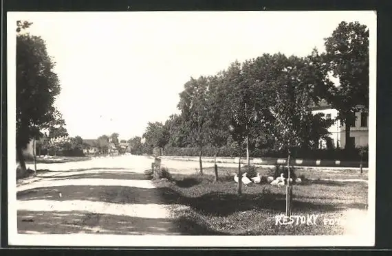Foto-AK Restoky, Strassenpartie mit Gänsen