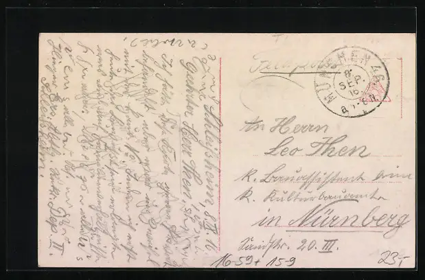 Personenbezogene Daten auf der Rückseite der Karte wurden durch blauen Textmarker unkenntlich gemacht. Die blauen Stellen sind auf die Vorderseite durchgeweicht und wirken sich negativ auf das Postkartenfoto aus