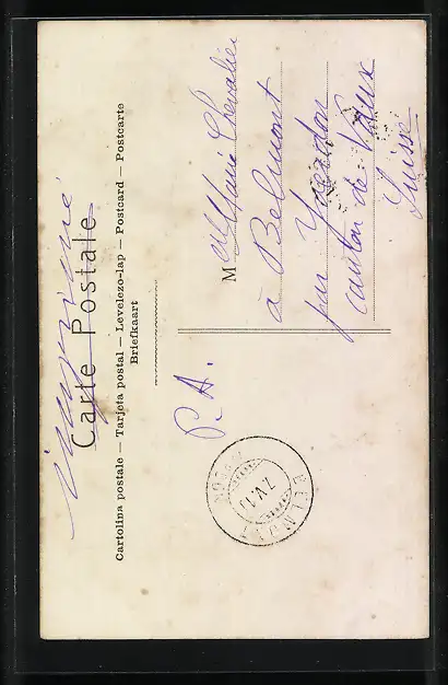 Personenbezogene Daten auf der Rückseite der Karte wurden durch blauen Textmarker unkenntlich gemacht. Die blauen Stellen sind auf die Vorderseite durchgeweicht und wirken sich negativ auf das Postkartenfoto aus