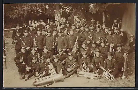 Foto-AK Schweizer Militärmusik-Kapelle mit Instrumenten in Uniform