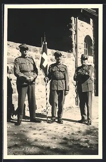 Foto-AK Schweizer Soldaten in Uniform mit Fahne