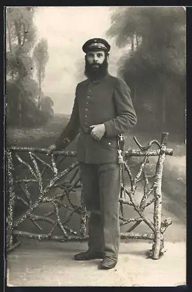 Foto-AK Soldat Luis Beger in Uniform mit Landsturm Bajonett und Vollbart