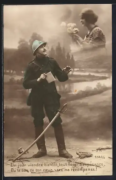 Foto-AK Soldat an der Front denkt an seine Frau
