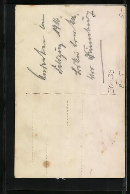 Personenbezogene Daten auf der Rückseite der Karte wurden durch blauen Textmarker unkenntlich gemacht. Die blauen Stellen sind auf die Vorderseite durchgeweicht und wirken sich negativ auf das Postkartenfoto aus