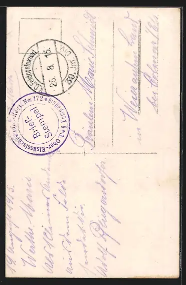 Personenbezogene Daten auf der Rückseite der Karte wurden durch blauen Textmarker unkenntlich gemacht. Die blauen Stellen sind auf die Vorderseite durchgeweicht und wirken sich negativ auf das Postkartenfoto aus