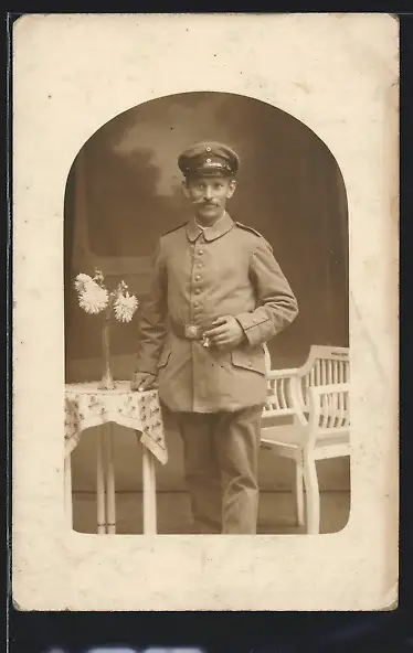 Foto-AK Soldat in Feldgrau Uniform mit Zigarre in der Hand