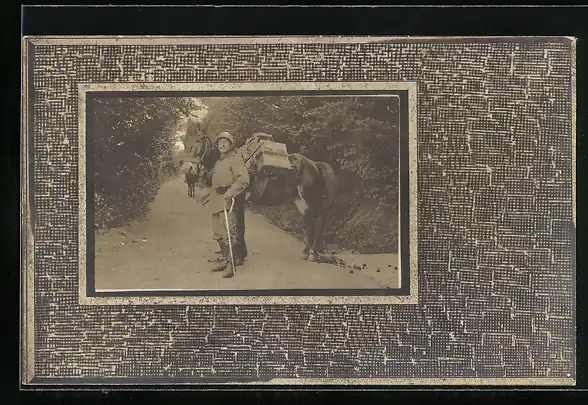 Foto-AK Soldat in Uniform mit Pferd, Passepartout