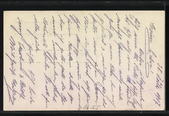 Personenbezogene Daten auf der Rückseite der Karte wurden durch blauen Textmarker unkenntlich gemacht. Die blauen Stellen sind auf die Vorderseite durchgeweicht und wirken sich negativ auf das Postkartenfoto aus