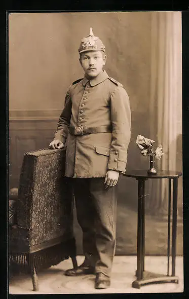 Foto-AK Soldat in Uniform mit Pickelhaube, Uniformfoto
