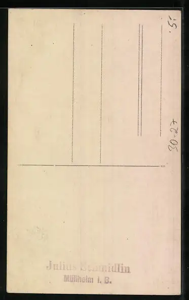 Personenbezogene Daten auf der Rückseite der Karte wurden durch blauen Textmarker unkenntlich gemacht. Die blauen Stellen sind auf die Vorderseite durchgeweicht und wirken sich negativ auf das Postkartenfoto aus