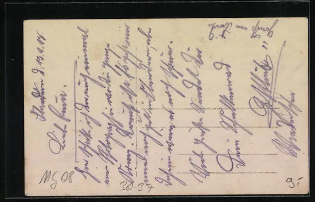 Personenbezogene Daten auf der Rückseite der Karte wurden durch blauen Textmarker unkenntlich gemacht. Die blauen Stellen sind auf die Vorderseite durchgeweicht und wirken sich negativ auf das Postkartenfoto aus