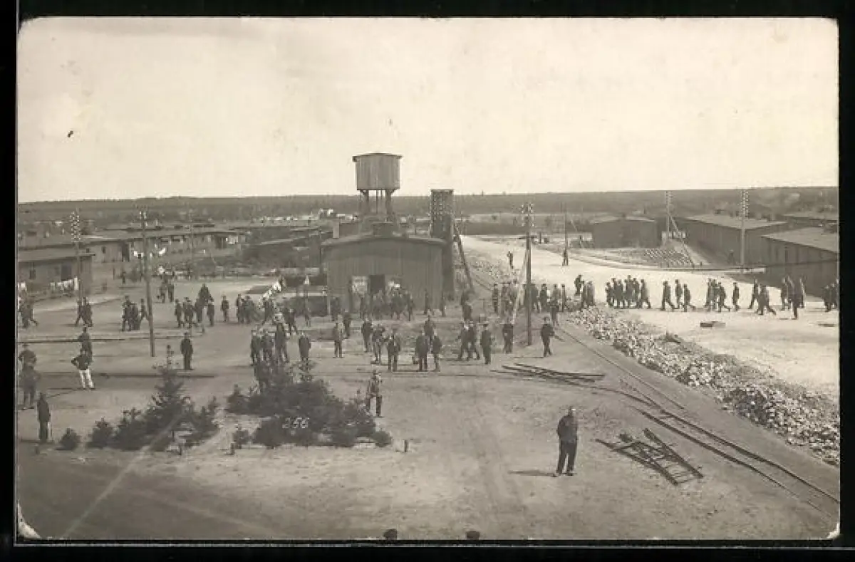 Foto-AK Soltau, Kriegsgefangenenlager, Ansicht der Lagerbaracken mit Wachturm