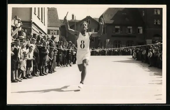 Foto-AK Staffelläufer erreicht mit erhobenen Armen die Ziellinie