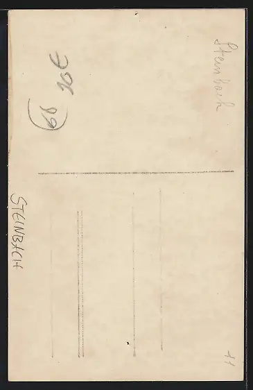 Personenbezogene Daten auf der Rückseite der Karte wurden durch blauen Textmarker unkenntlich gemacht. Die blauen Stellen sind auf die Vorderseite durchgeweicht und wirken sich negativ auf das Postkartenfoto aus