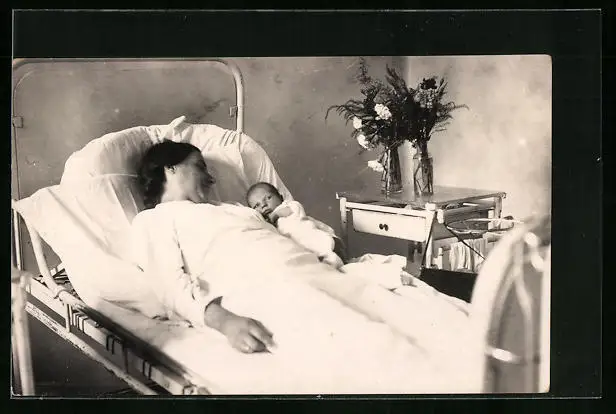 Foto-AK Stolze Mutter hält ihr Neugeborenes im Arm, Mutterglück