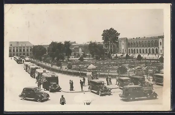 Foto-AK Teheran, Autos und Busse bei einer Parkanlage