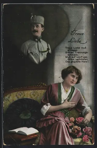 Foto-AK Treue Liebe..., Junge Frau in Gedanken, Soldat in Uniform