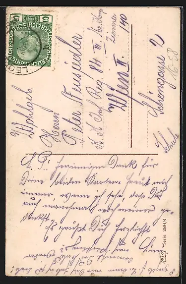 Personenbezogene Daten auf der Rückseite der Karte wurden durch blauen Textmarker unkenntlich gemacht. Die blauen Stellen sind auf die Vorderseite durchgeweicht und wirken sich negativ auf das Postkartenfoto aus