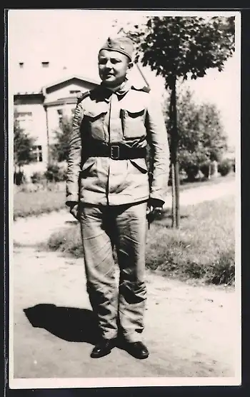 Foto-AK Tschechischer Soldat in Uniform mit Schiffchen im Garten