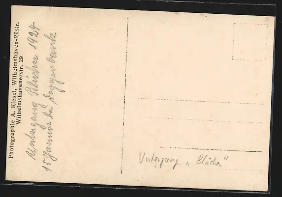 Personenbezogene Daten auf der Rückseite der Karte wurden durch blauen Textmarker unkenntlich gemacht. Die blauen Stellen sind auf die Vorderseite durchgeweicht und wirken sich negativ auf das Postkartenfoto aus