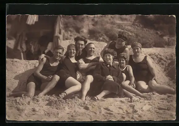Foto-AK Urlauber in Bademode beim Erinnerungsfoto am Strand von Rewahl 1922