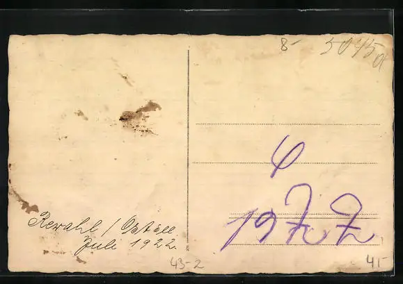 Personenbezogene Daten auf der Rückseite der Karte wurden durch blauen Textmarker unkenntlich gemacht. Die blauen Stellen sind auf die Vorderseite durchgeweicht und wirken sich negativ auf das Postkartenfoto aus
