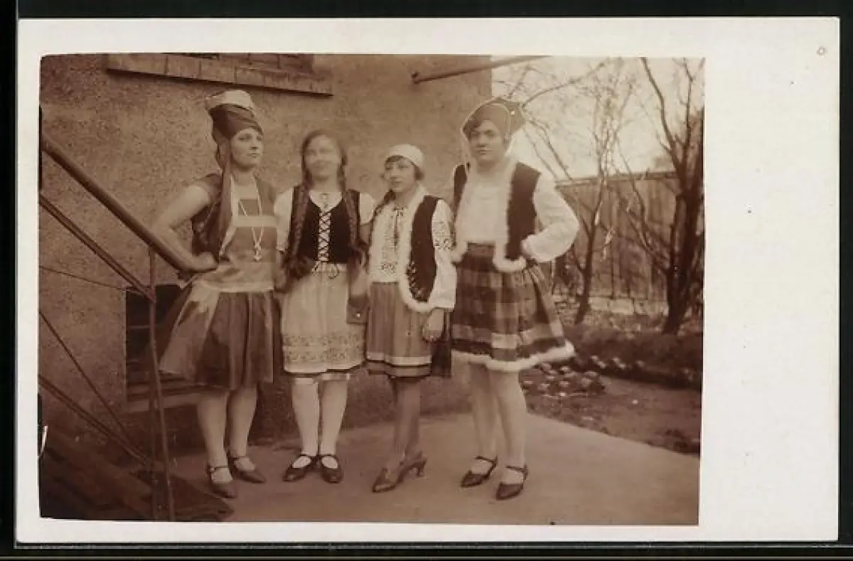 Foto-AK Vier junge Damen in Faschings-Verkleidung, 1928