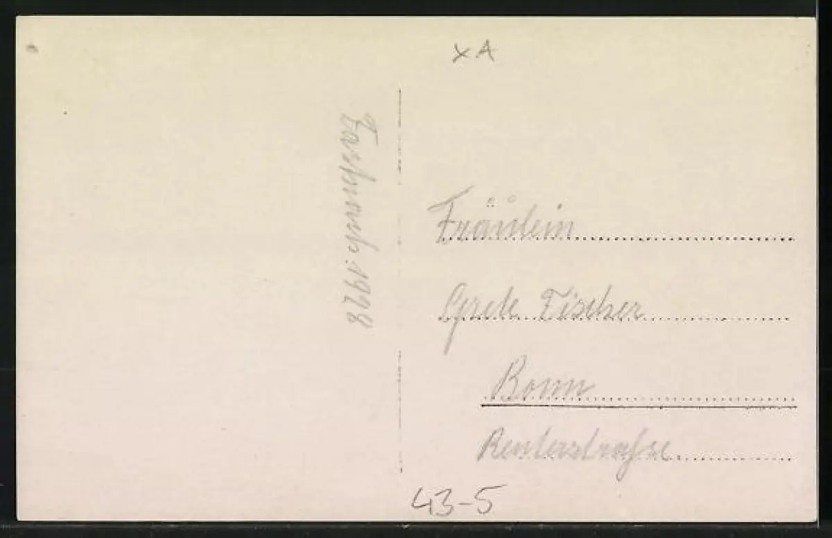Personenbezogene Daten auf der Rückseite der Karte wurden durch blauen Textmarker unkenntlich gemacht. Die blauen Stellen sind auf die Vorderseite durchgeweicht und wirken sich negativ auf das Postkartenfoto aus